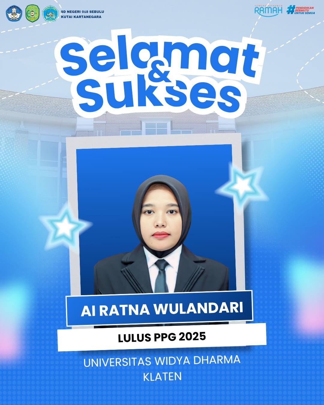 SD Negeri 018 Sebulu kembali mendapatkan kabar gembira dari jajaran pendidiknya. Ai Ratna Wulandari, salah satu guru berdedikasi di sekolah tersebut, resmi dinyatakan lulus Program Pendidikan Profesi Guru (PPG) Tahun 2025 dari Universitas Widya Dharma Klaten.