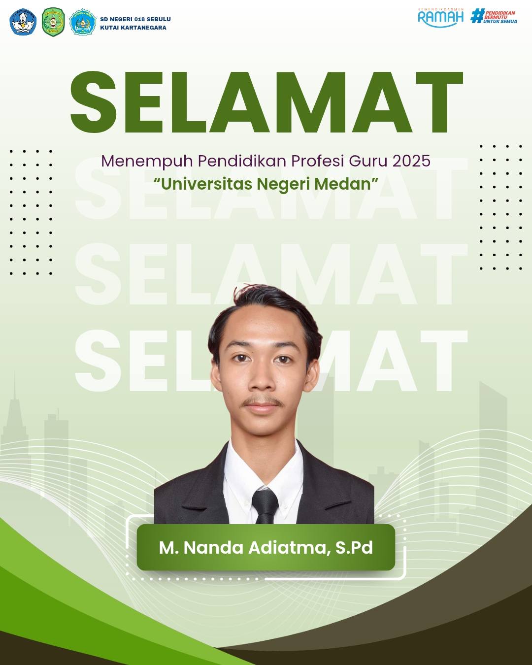 SD Negeri 018 Sebulu memberikan dukungan penuh kepada salah satu gurunya, Muhammad Nanda Adiatma, yang resmi mengikuti Program Pendidikan Profesi Guru (PPG) Tahun 2025 di Universitas Negeri Medan.