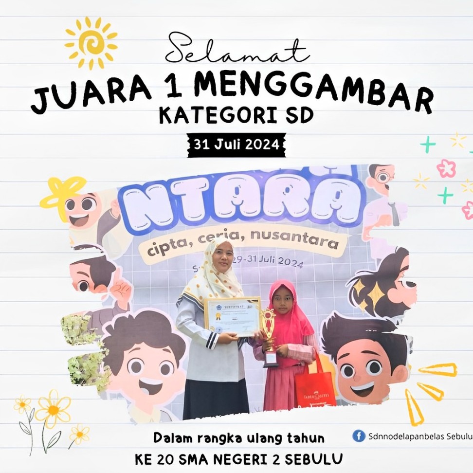 Selamat dan Sukses! 🎉 Kami dengan bangga mengucapkan selamat kepada Ananda Andini Nisa Ardani, siswa kelas III A SD Negeri 018 Sebulu, atas prestasi gemilang yang telah diraihnya. Dalam ajang Lomba Menggambar yang diselenggarakan dalam rangka ulang tahun SMA N 2 Sebulu, Andini berhasil meraih Juara I untuk kategori Sekolah